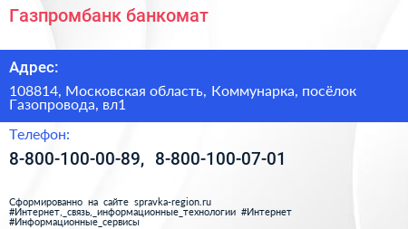 Газпромбанк, банкомат по адресу 108814, Московская область, Коммунарка, посёлок Газопровода, вл1 в дальнейшем Организация, размещена в следующих категориях: