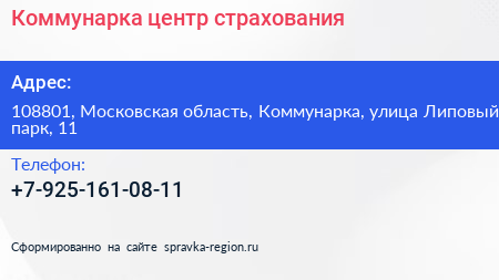 Коммунарка, центр страхования по адресу 108801, Московская область, Коммунарка, улица Липовый парк, 11 в дальнейшем Организация, размещена в следующих категориях: