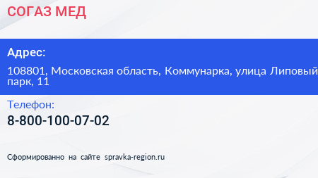 СОГАЗ-МЕД по адресу 108801, Московская область, Коммунарка, улица Липовый парк, 11 в дальнейшем Организация, размещена в следующих категориях: