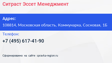 Ситраст Эссет Менеджмент по адресу 108814, Московская область, Коммунарка, Сосновая, 1Б в дальнейшем Организация, размещена в следующих категориях: