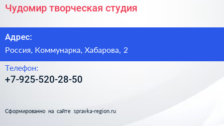 Чудомир, творческая студия по адресу Торгово-развлекательный комплекс "Новомосковский", 2, улица Хабарова, Филимонковский район, Московский, Москва, Центральный федеральный округ, 142784, Россия в дальнейшем Организация, размещена в следующих категориях: