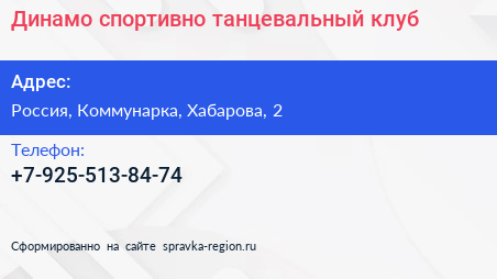 Динамо, спортивно-танцевальный клуб по адресу Торгово-развлекательный комплекс "Новомосковский", 2, улица Хабарова, Филимонковский район, Московский, Москва, Центральный федеральный округ, 142784, Россия в дальнейшем Организация, размещена в следующих категориях: