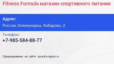 Fitness Formula, магазин спортивного питания по адресу Торгово-развлекательный комплекс "Новомосковский", 2, улица Хабарова, Филимонковский район, Московский, Москва, Центральный федеральный округ, 142784, Россия в дальнейшем Организация, размещена в следующих категориях: