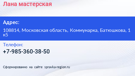 Лана, мастерская по адресу 108814, Московская область, Коммунарка, Батюшкова, 1 к5 в дальнейшем Организация, размещена в следующих категориях: