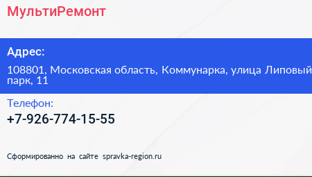 МультиРемонт по адресу 108801, Московская область, Коммунарка, улица Липовый парк, 11 в дальнейшем Организация, размещена в следующих категориях: