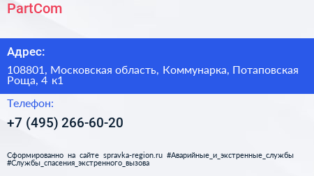 PartCom по адресу 108801, Московская область, Коммунарка, Потаповская Роща, 4 к1 в дальнейшем Организация, размещена в следующих категориях: