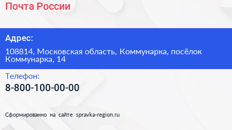 Почта России по адресу 108814, Московская область, Коммунарка, посёлок Коммунарка, 14 в дальнейшем Организация, размещена в следующих категориях: