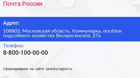 Почта России по адресу 108803, Московская область, Коммунарка, посёлок подсобного хозяйства Воскресенское, 27а в дальнейшем Организация, размещена в следующих категориях: