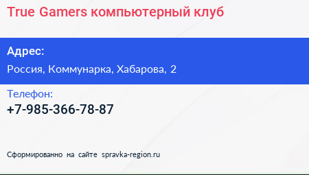 True Gamers, компьютерный клуб по адресу Торгово-развлекательный комплекс "Новомосковский", 2, улица Хабарова, Филимонковский район, Московский, Москва, Центральный федеральный округ, 142784, Россия в дальнейшем Организация, размещена в следующих категориях: