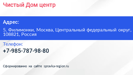 Чистый Дом, центр по адресу 5, Филимонки, Москва, Центральный федеральный округ, 108821, Россия в дальнейшем Организация, размещена в следующих категориях: