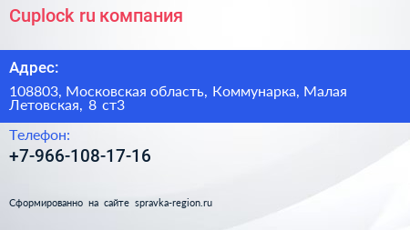 Cuplock.ru, компания по адресу 108803, Московская область, Коммунарка, Малая Летовская, 8 ст3 в дальнейшем Организация, размещена в следующих категориях: