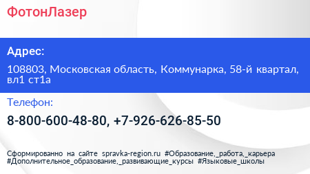 ФотонЛазер по адресу 108803, Московская область, Коммунарка, 58-й квартал, вл1 ст1а в дальнейшем Организация, размещена в следующих категориях: