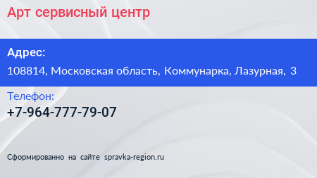 Арт, сервисный центр по адресу 108814, Московская область, Коммунарка, Лазурная, 3 в дальнейшем Организация, размещена в следующих категориях: