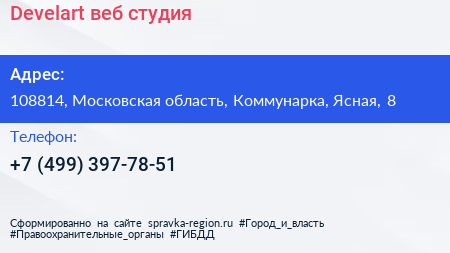 Develart, веб-студия по адресу 108814, Московская область, Коммунарка, Ясная, 8 в дальнейшем Организация, размещена в следующих категориях:
