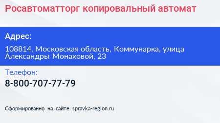 Росавтоматторг, копировальный автомат по адресу 108814, Московская область, Коммунарка, улица Александры Монаховой, 23 в дальнейшем Организация, размещена в следующих категориях: