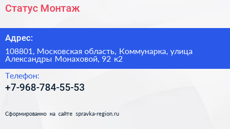 Статус Монтаж по адресу 108801, Московская область, Коммунарка, улица Александры Монаховой, 92 к2 в дальнейшем Организация, размещена в следующих категориях: