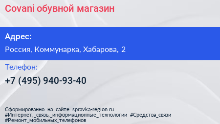 Covani, обувной магазин по адресу Торгово-развлекательный комплекс "Новомосковский", 2, улица Хабарова, Филимонковский район, Московский, Москва, Центральный федеральный округ, 142784, Россия в дальнейшем Организация, размещена в следующих категориях: