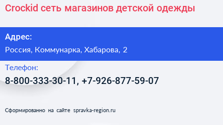 Crockid, сеть магазинов детской одежды по адресу Торгово-развлекательный комплекс "Новомосковский", 2, улица Хабарова, Филимонковский район, Московский, Москва, Центральный федеральный округ, 142784, Россия в дальнейшем Организация, размещена в следующих категориях: