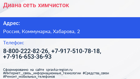 Диана, сеть химчисток по адресу Торгово-развлекательный комплекс "Новомосковский", 2, улица Хабарова, Филимонковский район, Московский, Москва, Центральный федеральный округ, 142784, Россия в дальнейшем Организация, размещена в следующих категориях:
