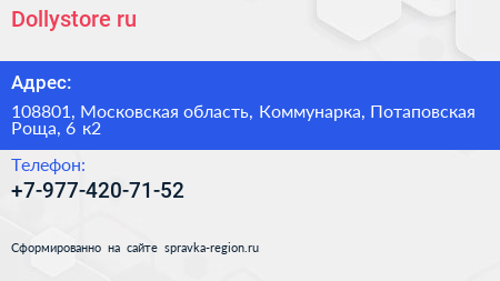 Dollystore.ru по адресу 108801, Московская область, Коммунарка, Потаповская Роща, 6 к2 в дальнейшем Организация, размещена в следующих категориях: