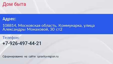 Дом быта по адресу 108814, Московская область, Коммунарка, улица Александры Монаховой, 30 ст2 в дальнейшем Организация, размещена в следующих категориях: