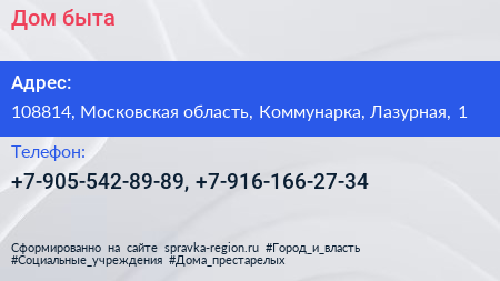 Дом быта по адресу 108814, Московская область, Коммунарка, Лазурная, 1 в дальнейшем Организация, размещена в следующих категориях:
