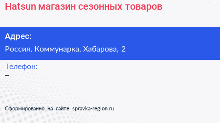 Hatsun, магазин сезонных товаров по адресу Торгово-развлекательный комплекс "Новомосковский", 2, улица Хабарова, Филимонковский район, Московский, Москва, Центральный федеральный округ, 142784, Россия в дальнейшем Организация, размещена в следующих категориях: