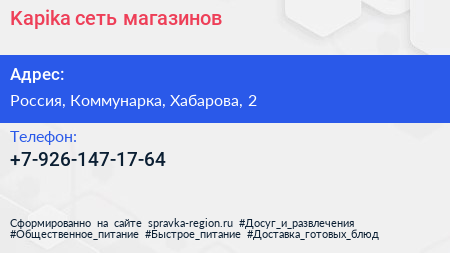 Kapika, сеть магазинов по адресу Торгово-развлекательный комплекс "Новомосковский", 2, улица Хабарова, Филимонковский район, Московский, Москва, Центральный федеральный округ, 142784, Россия в дальнейшем Организация, размещена в следующих категориях: