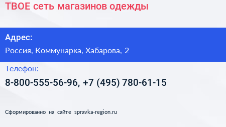 ТВОЕ, сеть магазинов одежды по адресу Торгово-развлекательный комплекс "Новомосковский", 2, улица Хабарова, Филимонковский район, Московский, Москва, Центральный федеральный округ, 142784, Россия в дальнейшем Организация, размещена в следующих категориях: