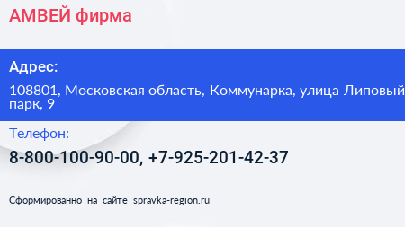 АМВЕЙ, фирма по адресу 108801, Московская область, Коммунарка, улица Липовый парк, 9 в дальнейшем Организация, размещена в следующих категориях: