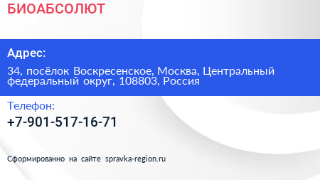 БИОАБСОЛЮТ по адресу 34, посёлок Воскресенское, Москва, Центральный федеральный округ, 108803, Россия в дальнейшем Организация, размещена в следующих категориях: