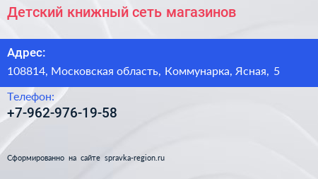 Детский книжный, сеть магазинов по адресу 108814, Московская область, Коммунарка, Ясная, 5 в дальнейшем Организация, размещена в следующих категориях:
