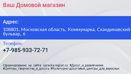 Ваш Домовой, магазин по адресу 108801, Московская область, Коммунарка, Скандинавский бульвар, 6 в дальнейшем Организация, размещена в следующих категориях: