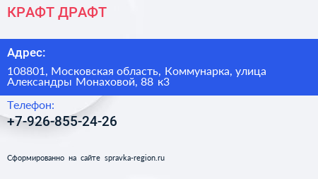 КРАФТ & ДРАФТ по адресу 108801, Московская область, Коммунарка, улица Александры Монаховой, 88 к3 в дальнейшем Организация, размещена в следующих категориях: