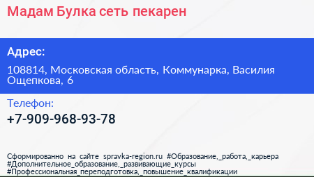 Мадам Булка, сеть пекарен по адресу 108814, Московская область, Коммунарка, Василия Ощепкова, 6 в дальнейшем Организация, размещена в следующих категориях: