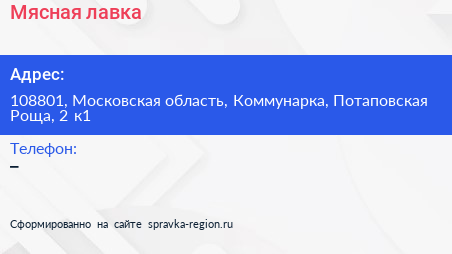 Мясная лавка по адресу 108801, Московская область, Коммунарка, Потаповская Роща, 2 к1 в дальнейшем Организация, размещена в следующих категориях: