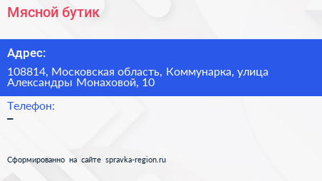 Мясной бутик по адресу 108814, Московская область, Коммунарка, улица Александры Монаховой, 10 в дальнейшем Организация, размещена в следующих категориях: