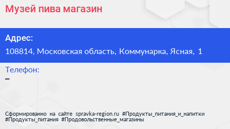 Музей пива, магазин по адресу 108814, Московская область, Коммунарка, Ясная, 1 в дальнейшем Организация, размещена в следующих категориях: