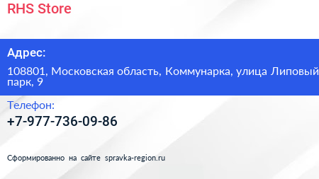 RHS Store по адресу 108801, Московская область, Коммунарка, улица Липовый парк, 9 в дальнейшем Организация, размещена в следующих категориях: