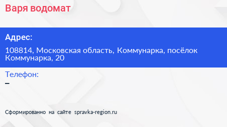 Варя, водомат по адресу 108814, Московская область, Коммунарка, посёлок Коммунарка, 20 в дальнейшем Организация, размещена в следующих категориях: