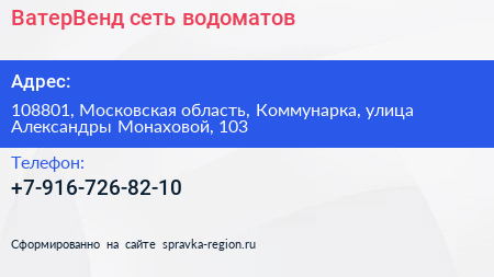ВатерВенд, сеть водоматов по адресу 108801, Московская область, Коммунарка, улица Александры Монаховой, 103 в дальнейшем Организация, размещена в следующих категориях: