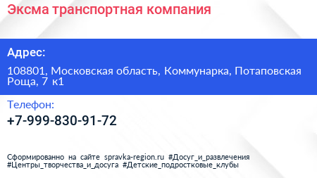 Эксма, транспортная компания по адресу 108801, Московская область, Коммунарка, Потаповская Роща, 7 к1 в дальнейшем Организация, размещена в следующих категориях: