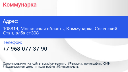 Коммунарка по адресу 108814, Московская область, Коммунарка, Сосенский Стан, вл5а ст308 в дальнейшем Организация, размещена в следующих категориях: