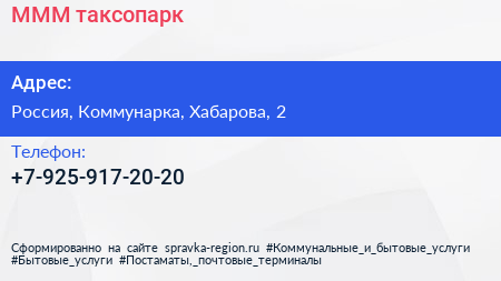 МММ, таксопарк по адресу Торгово-развлекательный комплекс "Новомосковский", 2, улица Хабарова, Филимонковский район, Московский, Москва, Центральный федеральный округ, 142784, Россия в дальнейшем Организация, размещена в следующих категориях: