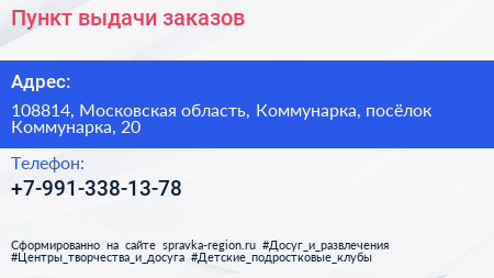 Пункт выдачи заказов по адресу 108814, Московская область, Коммунарка, посёлок Коммунарка, 20 в дальнейшем Организация, размещена в следующих категориях: