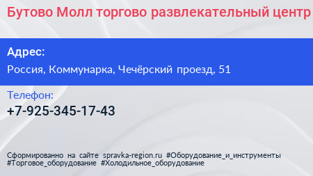 Бутово Молл, торгово-развлекательный центр по адресу Торгово-развлекательный центр "Бутово Молл", 51, Чечёрский проезд, Гарнизон Остафьево, район Щербинка, Москва, Центральный федеральный округ, 117042, Россия в дальнейшем Организация, размещена в следующих категориях: