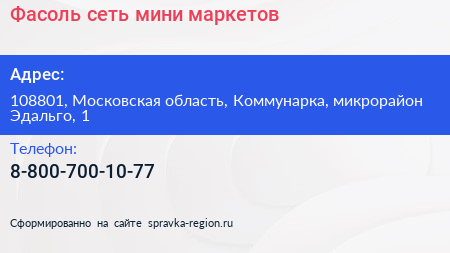 Фасоль, сеть мини-маркетов по адресу 108801, Московская область, Коммунарка, микрорайон Эдальго, 1 в дальнейшем Организация, размещена в следующих категориях: