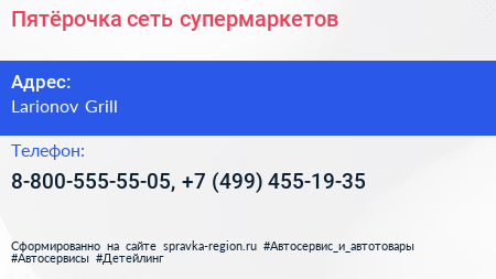Пятёрочка, сеть супермаркетов по адресу Larionov Grill в дальнейшем Организация, размещена в следующих категориях: