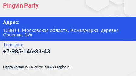Pingvin Party по адресу 108814, Московская область, Коммунарка, деревня Сосенки, 19а в дальнейшем Организация, размещена в следующих категориях: