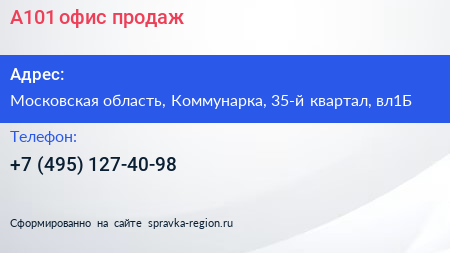 А101, офис продаж по адресу Московская область, Коммунарка, 35-й квартал, вл1Б в дальнейшем Организация, размещена в следующих категориях:
